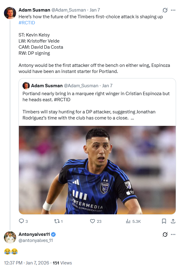 The two emojis seem to convey mockery, like he can’t believe the observation that Susman surmised. This statement from Susman would have been factually correct if Cristian Espinoza did choose to sign with the Portland Timbers this offseason. However, I want to believe that three laughing emojis are just as they appear to be: genuine laughter at a comment he could perceive as funny. HOWEVER, maybe both sets of emojis portray the same feeling. It’s not my job to parse this out. I’m just reporting.
