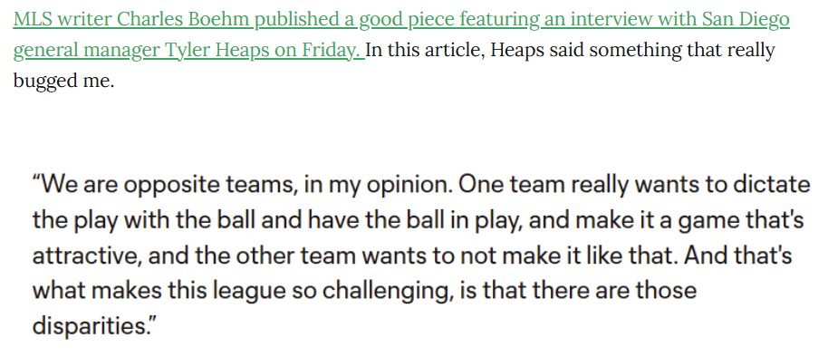 I barely found any of San Diego’s play tonight “attractive.” Instead, I saw a performance that resembled Portland’s struggles in Minnesota last weekend. Not entirely, but a gigantic amount of horseshoeing is one major commonality. I’d argue that the Timbers played a much more attractive game than San Diego did tonight. But since Mikey Varas and Tyler Heaps are so committed to this style of play (and have lost 5 straight games without any major tactical changes), I think it’s worth checking in on San Diego’s fanbase to see how much of last year’s success has crept into delusion regarding this year’s disappointing start.