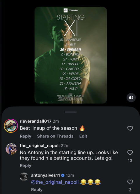He replied to the trolling comment under the starting lineup with 3 laughing emojis. However, under Adam Susman’s sincere observation, he only left 2 laughing emojis. WHAT DOES THIS MEAN?