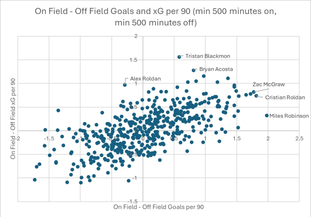 This is a graph of several players and the difference between goals scored with and without them on the pitch plotted with the team’s xG within the same criteria. Besides the shocking appearance of the Roldans (eww, but at least it tracks for Cristian) and a surprise appearance from Bryan Acosta (hi Bryan), this is the best piece of evidence I have for McGraw’s importance to the team as a whole. Taking finishing into account, this team is scoring about 1.7 more goals per 90 with McGraw on the pitch. The xG difference calculates at about +0.75, but xG doesn’t win games. Goals do. Only Cristian Roldan and Miles Robinson have a larger goal differential than McGraw does. This isn’t a coincidence. When he is on the field, the team is scoring more. Which means they are winning more. Robinson and Tristan Blackmon are the only center backs besides McGraw who have separated themselves in a positive way on this graph. Let’s see if they got nominated for Defender of the Year.