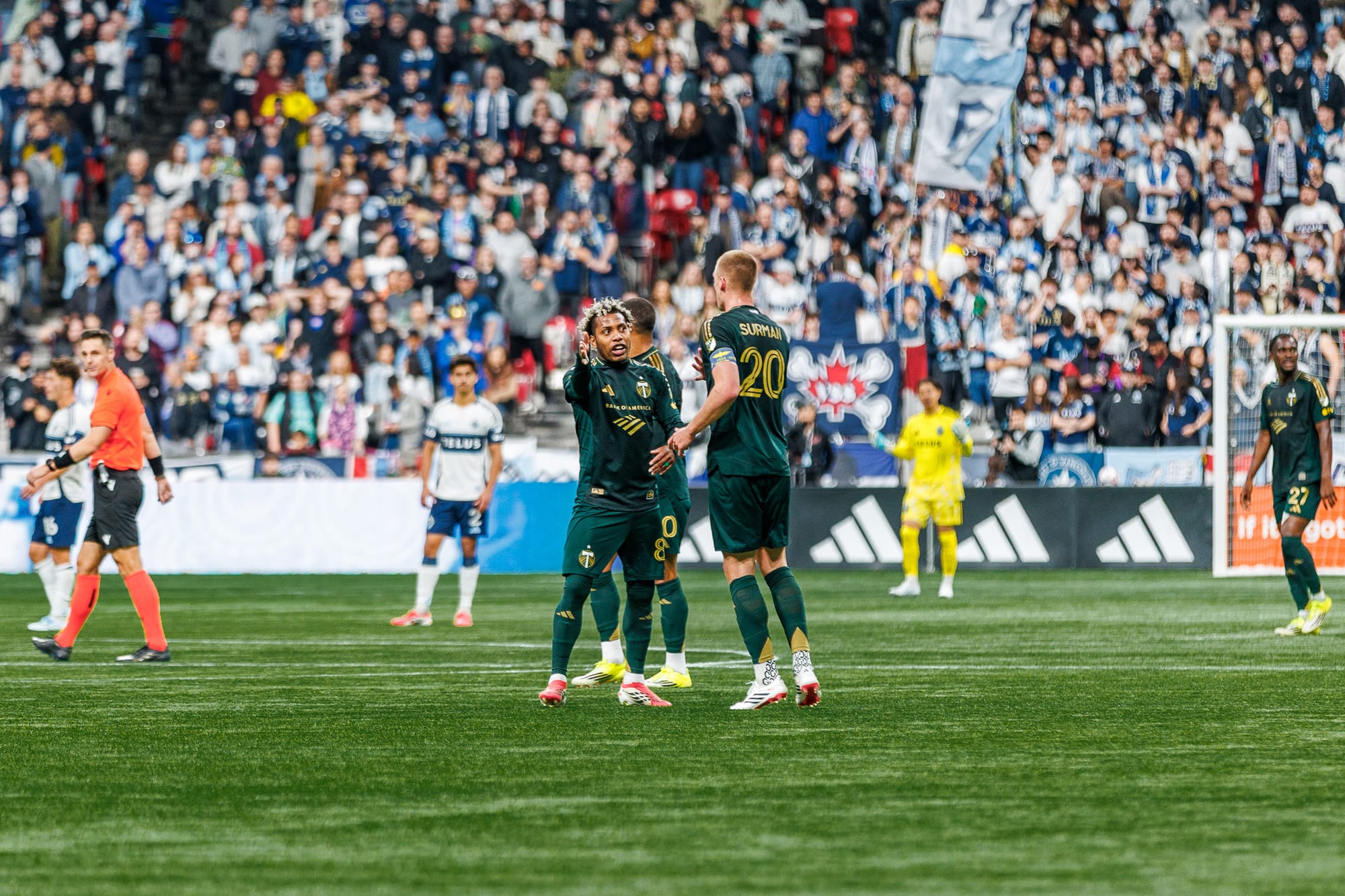 Meanwhile, the Timbers were completely out of it from a collective standpoint. But the front office has spent years investing in talented players. Sometimes that talent steps up, creates something out of nothing, and Portland is able to put the ball in the back of the net. The 36th minute arrived, and the Timbers had a corner kick. Velde’s delivery was cleared, but Antony was able to latch onto the clearance and move it back to the Norwegian. Antony continued his run and received another slip pass (taking note of that) but his cutback cross was easily cleared amidst a mass of Whitecaps. The clearance fell to Juan Mosquera at the top of the box, who unleashed a perfect volley past Takaoka at the far post. Out of absolutely nothing, Portland had equalized. Mosquera ran to the corner and celebrated with his teammates; busting out a couple of dance moves in front of some very angry Canadians. Last year, Kamal Miller struck gold with a similar volley from outside the box. Now it was Mosquera’s turn to use the power of the individual to get the Timbers back in the game.