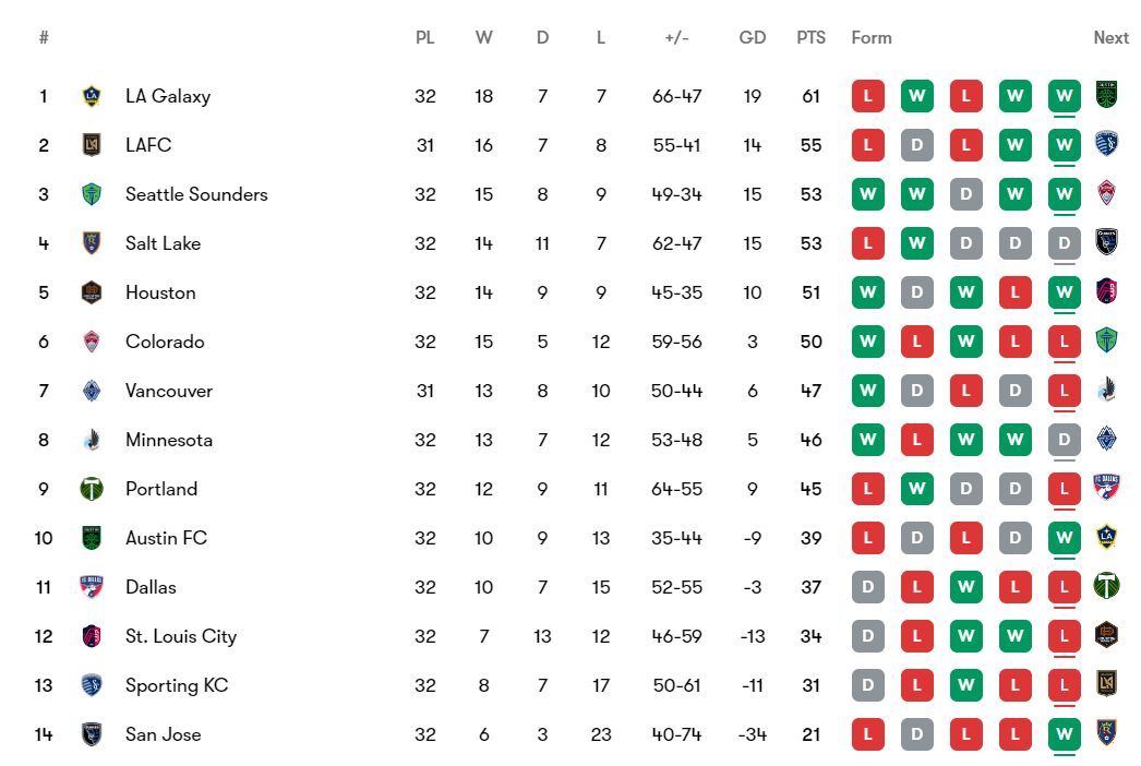 Vancouver hosts Minnesota on Saturday. The best possible result for Portland is a draw. The Whitecaps would have 48 points, and Minnesota would have 47. The Timbers have to beat Dallas on Sunday no matter what. If you thought the Timbers s***ting the bed tonight was bad, Dallas lost 3-2 in San Jose tonight to a heavily rotated Quakes team. They are now eliminated from the playoffs, but they will be motivated because interim head coach Peter Luccin is making his case for the permanent job. If Portland wins, they will be in 7th place on 48 points with a superior goal differential (both Portland and Vancouver would have 13 wins). However, Vancouver’s pesky game in hand will take place during the international break. It will be a home game against LAFC. In order for Portland to hold on to 7th place for Decision Day, the Whitecaps need to lose to the Black-and-Gold. 5th-place Houston (6 points ahead) and 6th-place Colorado (5 points ahead) have difficult matchups at St. Louis and at home against Seattle, respectively. There is still chaos that can happen, but the Timbers’ control on it is significantly weakened by tonight’s loss.