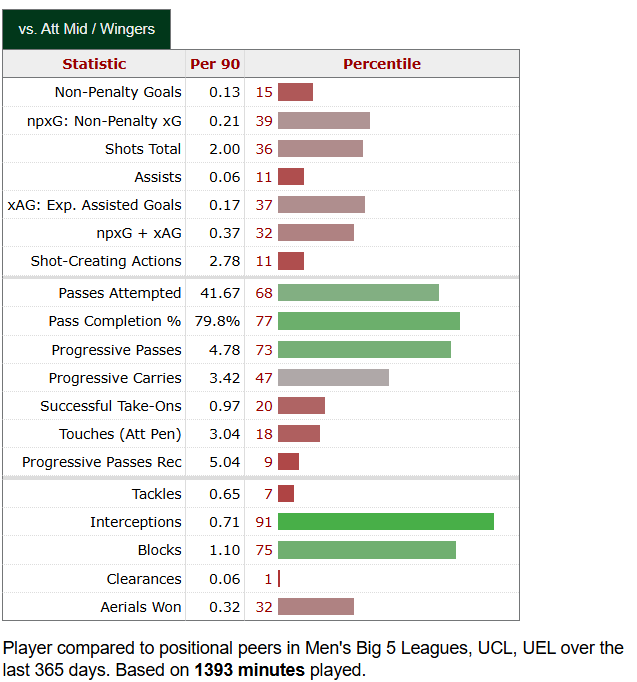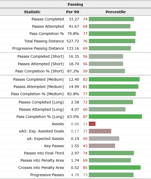 These numbers are coming from a top-five league. That’s a lot of green with one glaring red line: assists. However, assists aren’t in a player’s control. They can set the table, but it’s up to the finisher to finish. Da Costa will be given a lot more responsibility in Portland to run the show. Based on what he’s done for Lens, I think it moves him closer to the box. Goals and assists will follow.