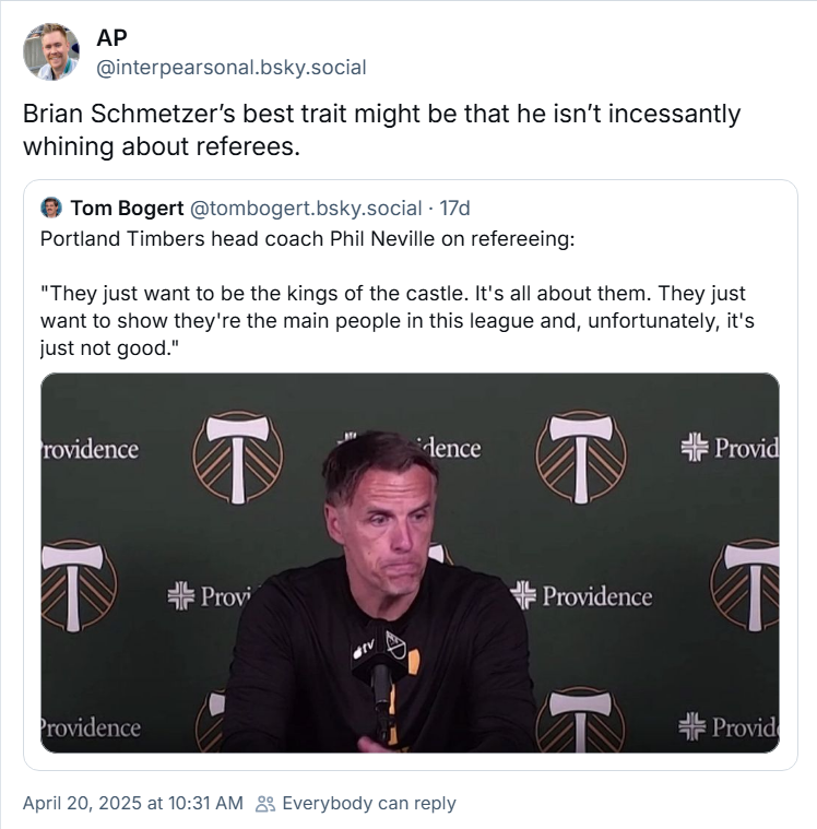 This isn’t entirely a Neville problem either. The teams in the back half of Giovanni Savarese’s tenure also had this issue. I don’t know if it can be coached out. It’s a pure mentality problem. However, Neville preaches mentality over everything. He has to find a way to solve this problem. This isn’t limited to conceding goals, either. After Kelsy scored the winning goal tonight, the Defiance IMMEDIATELY won a corner kick (that was actually a throw-in) and nearly scored the equalizer from it. The Timbers turn every goal (for and against) into an opportunity for the opposition to create scoring chances. It still befuddles me. And it has to be fixed.