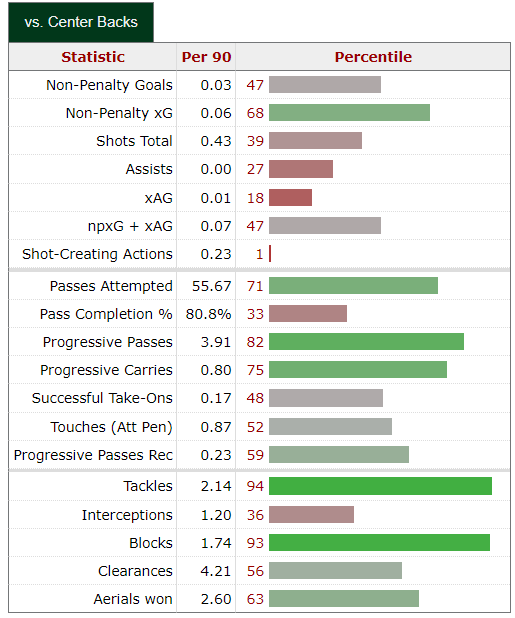 Now we can dig into the numbers, and there are a couple of really juicy ones here. Timbers CBs often cycle the ball out to the wings or play long balls over the top. Araujo’s progressive pass and carry numbers give us a true ball-playing center back. This is the Bill Tuiloma replacement we’ve been looking for. Araujo can also hit a mean free kick. The tackle and block numbers are also outstanding. He can be a real difference maker for the Timbers.