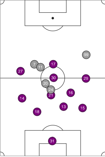 This is the average player positions map from tonight’s game. All the starters are shown in purple. Somehow, we had a 4-2-3-1 shape in the first half. Zac McGraw said in the post-game press conference that the goal was to limit Vancouver’s chances in the first half. While they didn’t do a great job of it, the map does speak to that. The most curious aspect of that, however, is Diego Gutierrez’s positioning right next to Diego Chara. His performance there highlighted how much Eryk Williamson was missed in the squad. There was no true ball progressor in the midfield tonight. Once Evander and Niezgoda came on at halftime to replace Gutierrez and Tega Ikoba, you can see a 4-3-3 form take shape with Moreno and Evander as dual 8s. That did lead to a little bit of forward movement, but the final ball was never there. Franck Boli did look dangerous when he entered, but he can only do so much with such a lack of service.