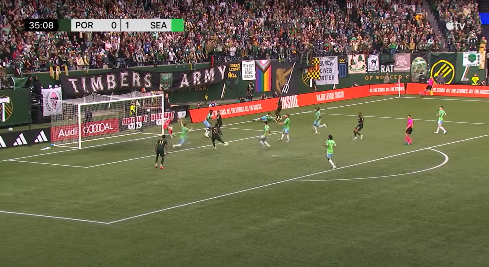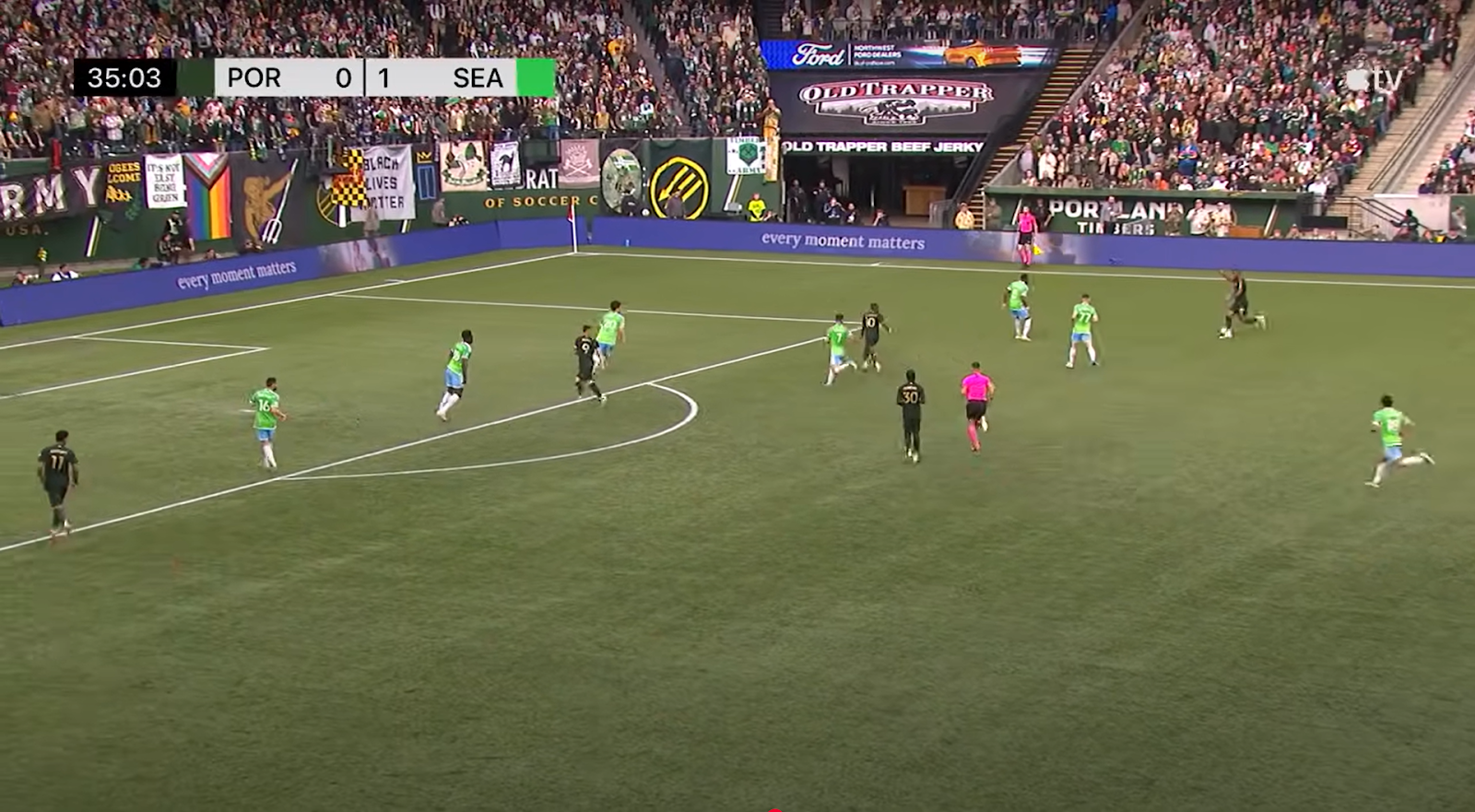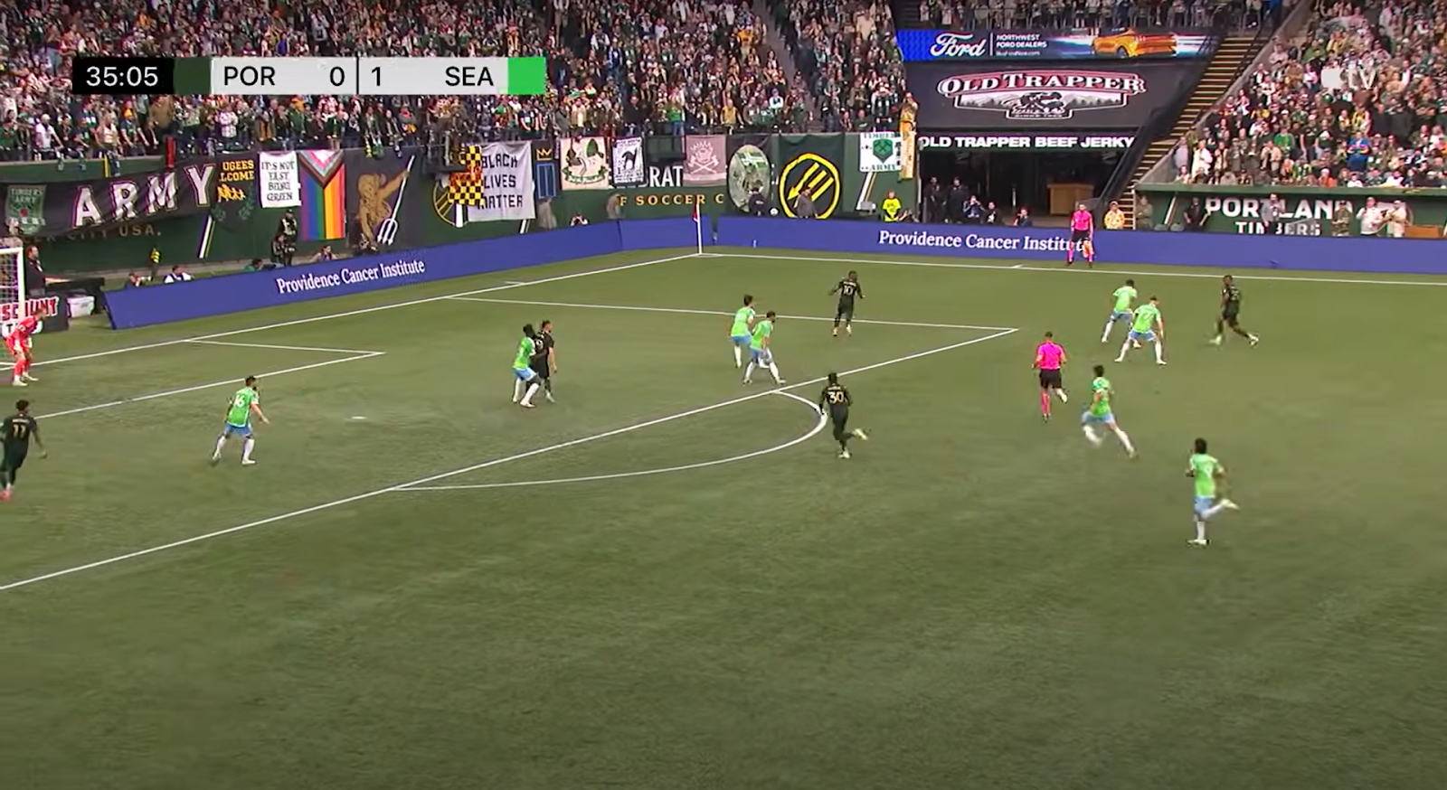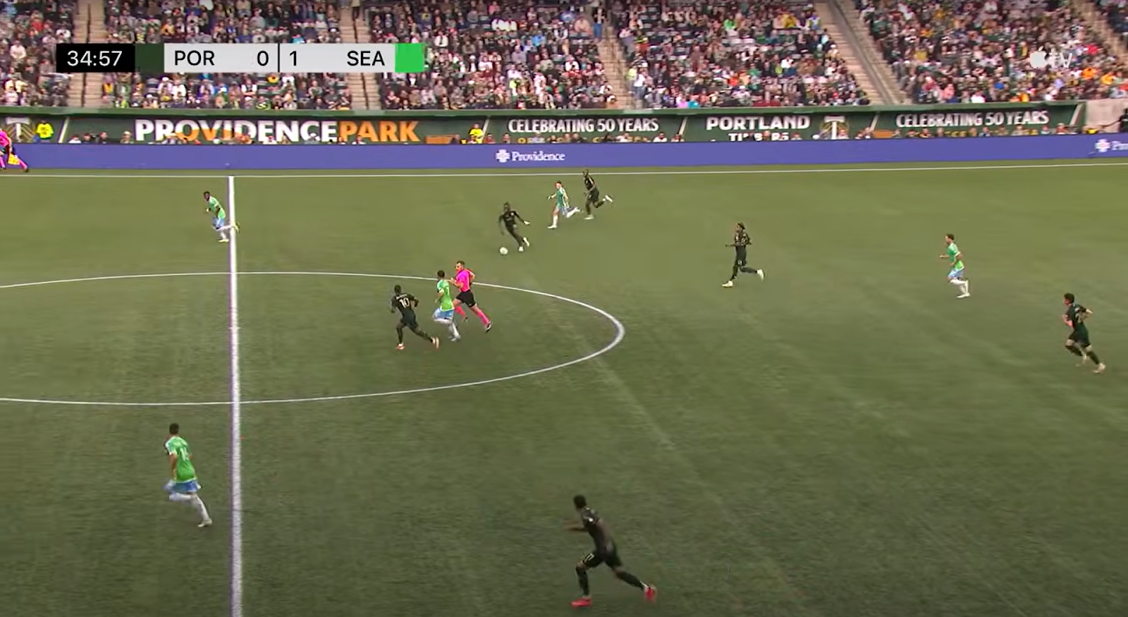 After Da Costa finds Mosquera on the wing, both teams decide to completely switch their identities. Look at the giant gap between Nouhou and Kim Kee-Hee. This is a very Timbers thing to do, and the Sounders are about to get punished for copying their rivals. It’s also worth noting that Da Costa and Moreno have effectively switched positions. That’s a positive aspect of Portuguese Dave’s ability on the wing; the Timbers can effectively switch their front four around with fluidity.