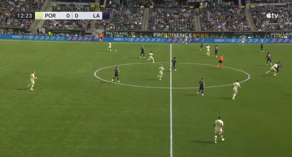 Kamal Miller doesn’t see the run, and misses the opportunity for a long ball (that he has the skill to properly execute). He’s facing zero pressure, only the threat of pressure from Joao Klauss. At this point, the Timbers are no longer in their buildup phase. The ball has been properly progressed because the Galaxy decided to drop their line of confrontation deeper after they failed to win the ball higher up the pitch.