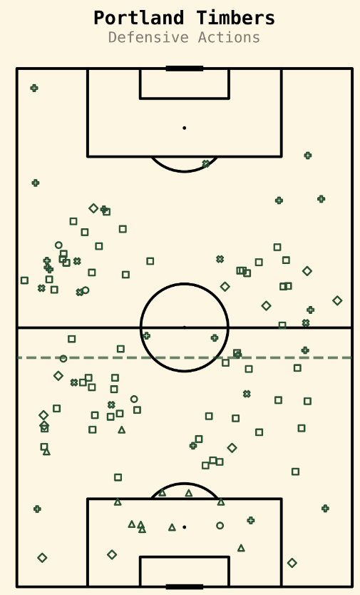 This map brings joy to my eyes. With a better defensive shape, the Timbers were able to win the ball back higher up the pitch and press their advantage. The real struggle came around the box, when the Timbers were unable to get creative to find openings. They were playing scared, not safe. During the first half, two Brazilians (Evander and Antony), Dairon Asprilla (the chaos king), Santiago Moreno and Juan Mosquera (two wild-cards) were on the pitch and none of them were willing to try anything wacky. After the Seattle game, I was begging for the Timbers to introduce chaos into this game. It desperately needed it. A lot of these defensive actions came from the first half, and the Timbers did not capitalize on them. Something to keep working on.