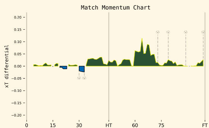The first graphic of note is the match momentum chart, measured by xT (expected threat). This metric measures the value of possession that each team has during a match.