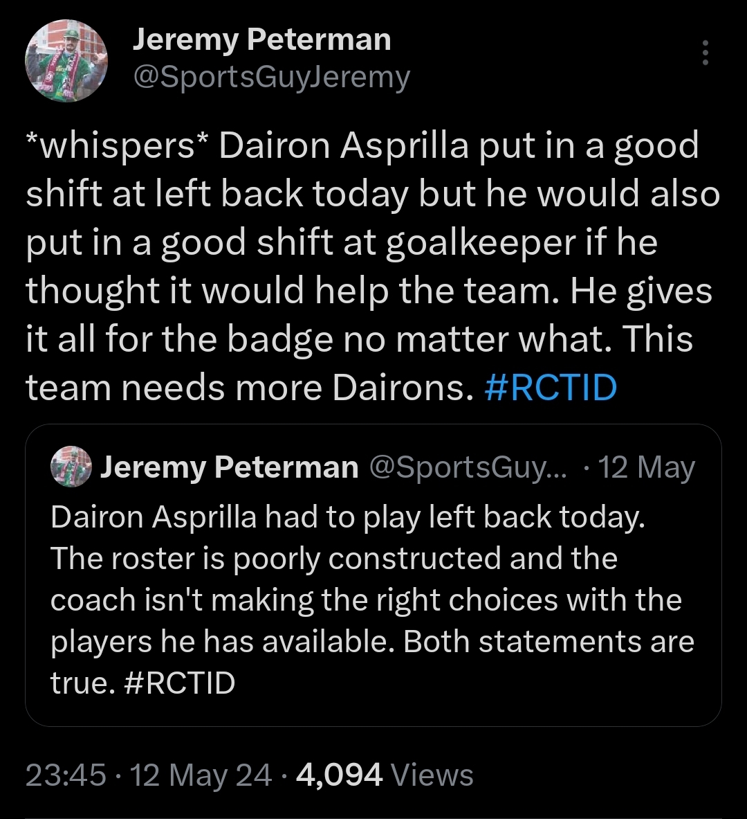My full breakdown of Dairon Asprilla’s departure from Portland will be coming this week. But tonight was a celebration of his entire Timbers’ tenure. And he treated us to a true Dairon masterclass. No, there were no bicycle kick attempts, but Dairon did what he always does: play his absolute ASS off for the badge. Technically, he entered today’s game at right back. I would like to direct your attention to this tweet.